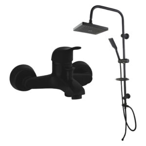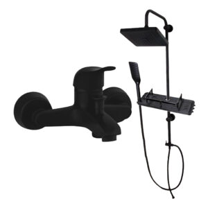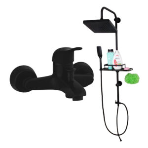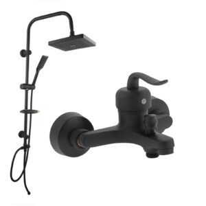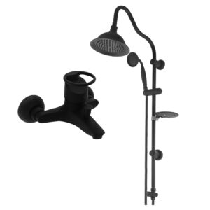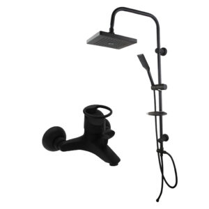 شیرآلات کامل مشکی النگویی سبددار همراه علم دوش دوکاره حمام سبددار و شلنگ توالت مجموعه 6 عددی