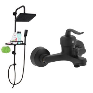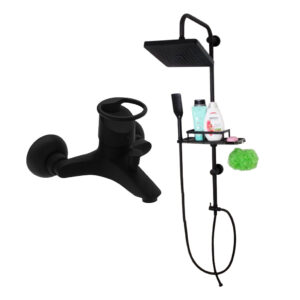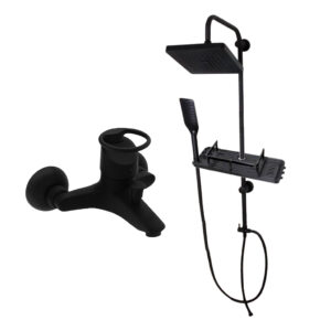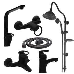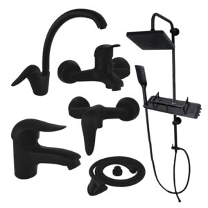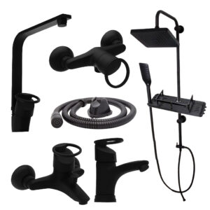 شیرآلات کامل مشکی النگویی همراه علم دوش دوکاره حمام و شلنگ توالت مجموعه 6 عددی