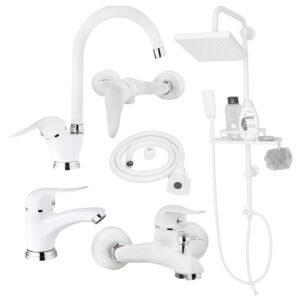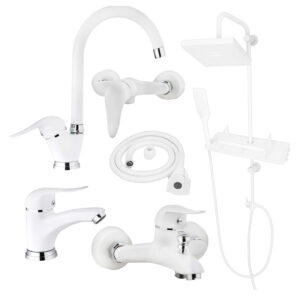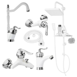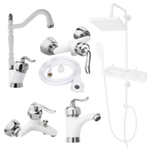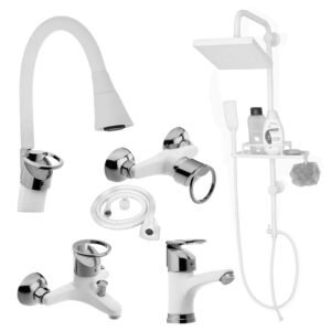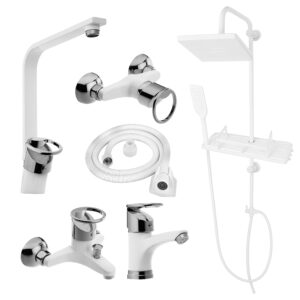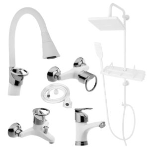 شیرآلات قاصدک سفیدکروم سبددار همراه علم دوش دوکاره حمام سبددار و شلنگ توالت مجموعه 6 عددی