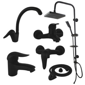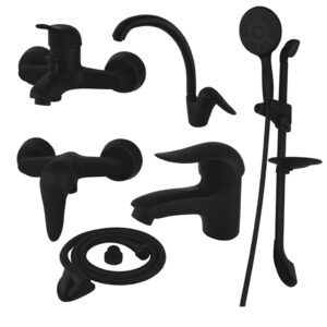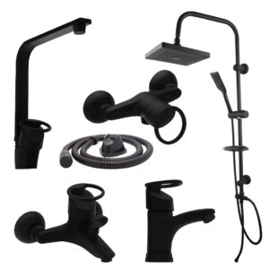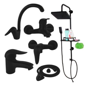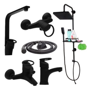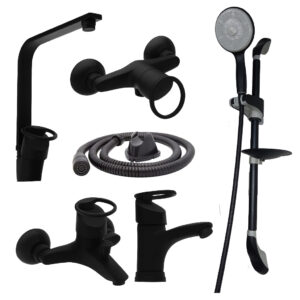 شیرآلات کامل مشکی النگویی همراه علم دوش حمام و شلنگ توالت مجموعه 6 عددی