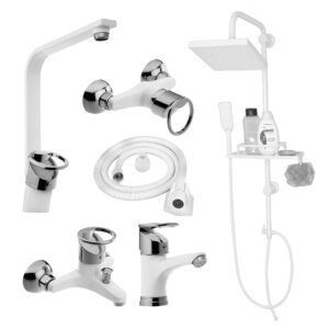 شیرآلات النگویی سفیدکروم سبددار همراه علم دوش دوکاره حمام سبددار و شلنگ توالت مجموعه 6 عددی